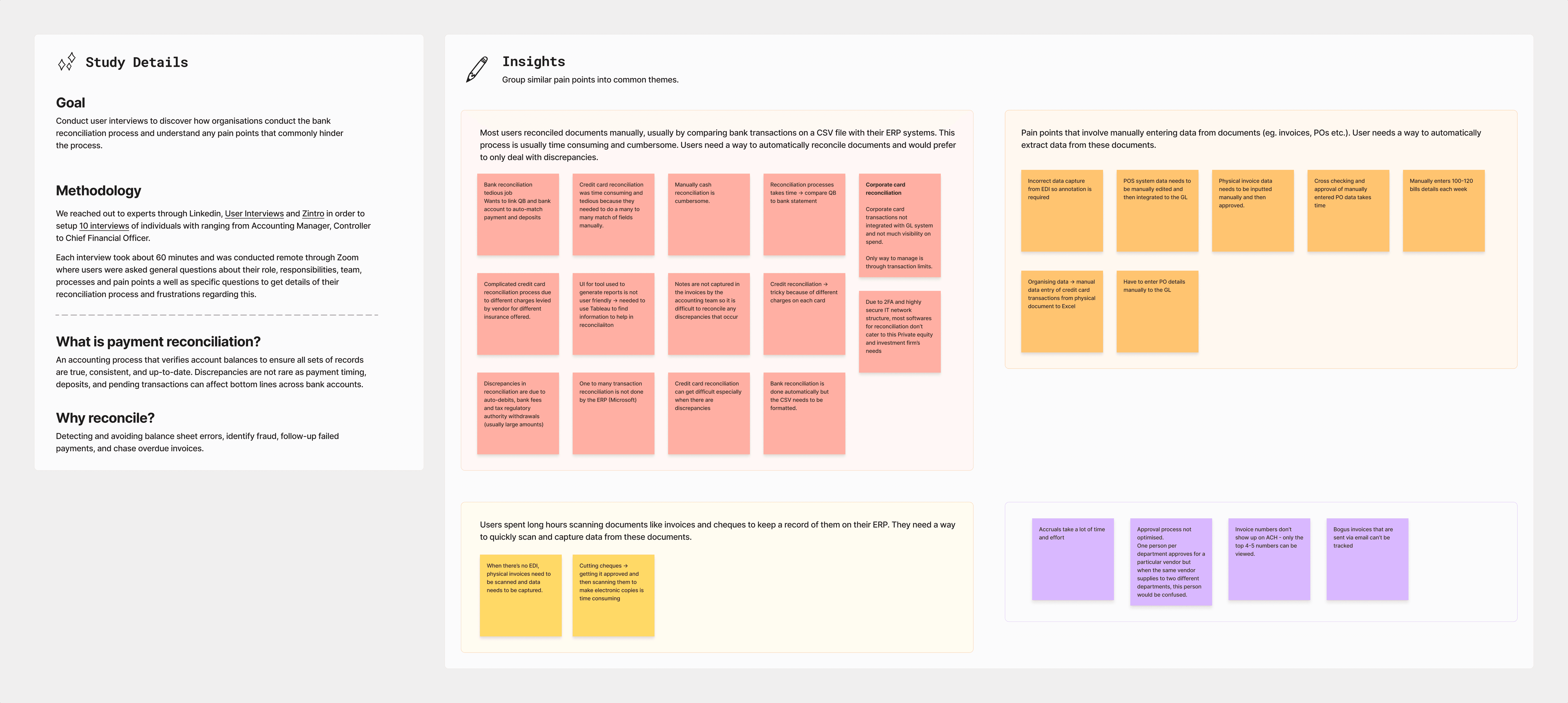 As reconciliation was a new domain for the team, we lacked a deep understanding of the specific requirements and challenges associated with the reconciliation process. To bridge this knowledge gap and gain valuable insights into the process, its pain points, and market gaps, we initiated a series of expert interviews. These interviews helped us understand the complexities of existing solutions, and identify areas where there was a clear opportunity to improve the user experience and streamline the process.